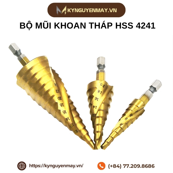 Bộ mũi khoan tháp HSS 4241 là lựa chọn lý tưởng cho các công việc khoan lỗ nhiều kích thước với độ chính xác cao và bề mặt gia công đẹp. Nhờ chất liệu thép gió HSS bền bỉ, sản phẩm đáp ứng tốt nhu cầu khoan trên nhiều loại vật liệu khác nhau, mang lại hiệu quả làm việc ổn định và lâu dài. Để được tư vấn chi tiết, quý khách vui lòng liên hệ Kỷ Nguyên Máy qua hotline: 077.209.8686.