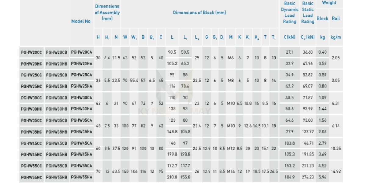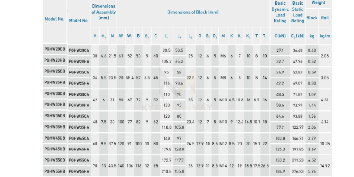 Con trượt ray PGHW được sản xuất với nhiều mã sản phẩm khác nhau giúp khách hàng dễ dàng lựa chọn sản phẩm phù hợp nhất với thiết bị của mình. Sự đa dạng này đảm bảo rằng luôn có một giải pháp tối ưu cho mọi ứng dụng, từ những hệ thống nhỏ gọn đến những hệ thống quy mô lớn.