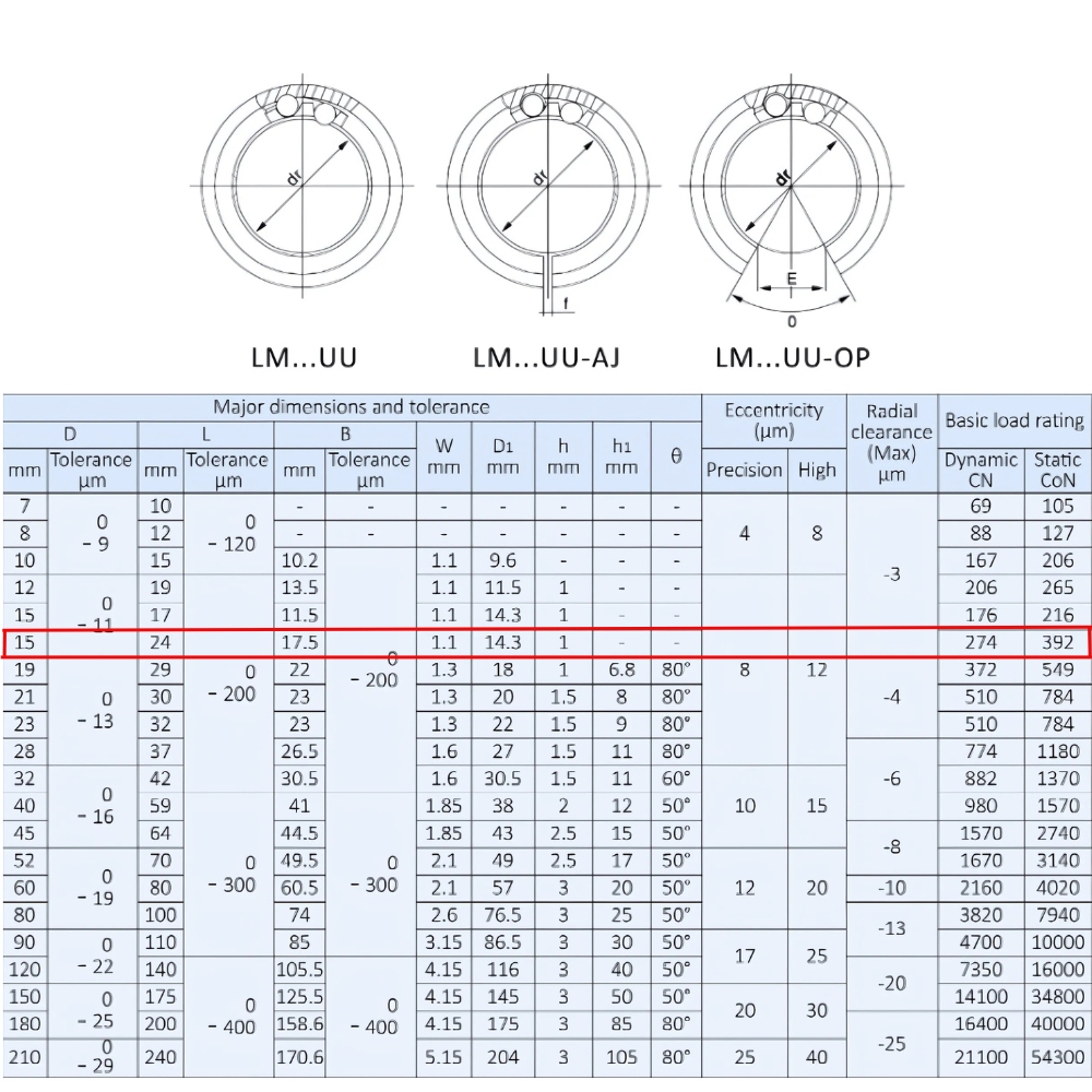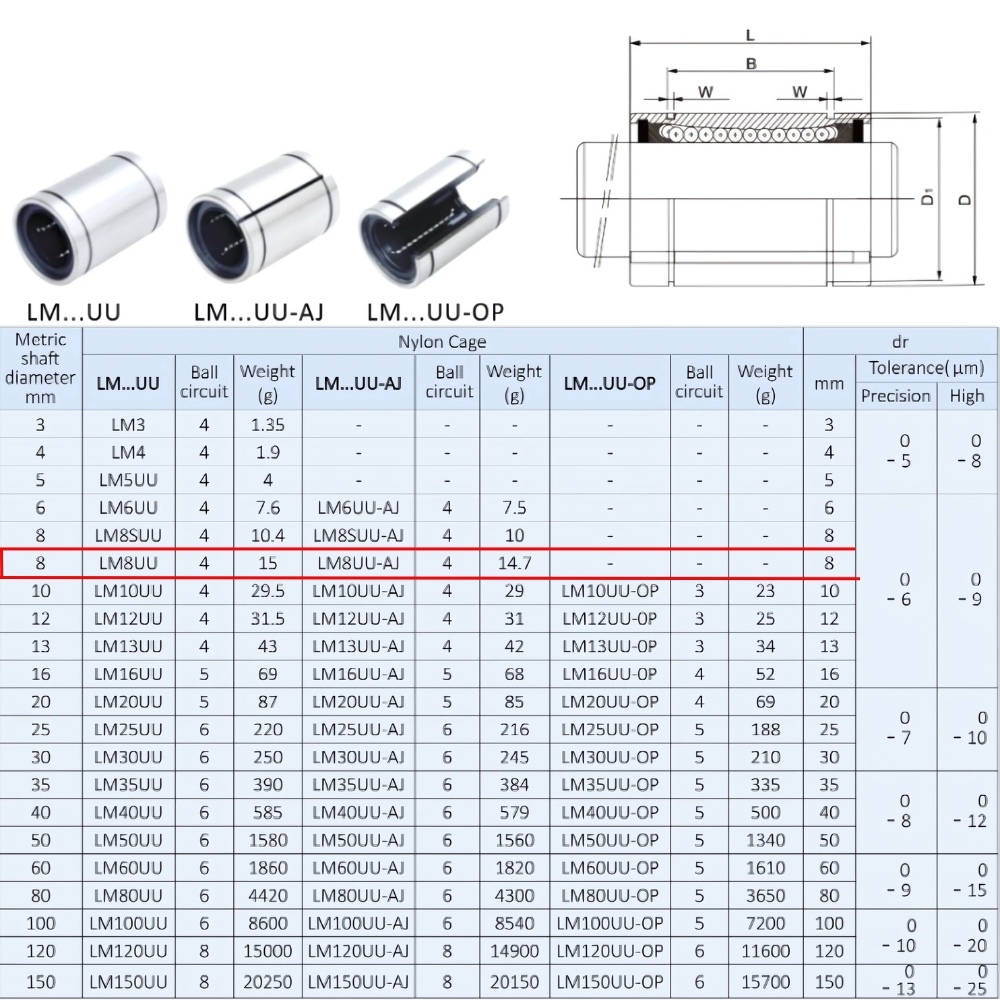 Ảnh thông số kỹ thuật bạc đạn trượt LM8UU