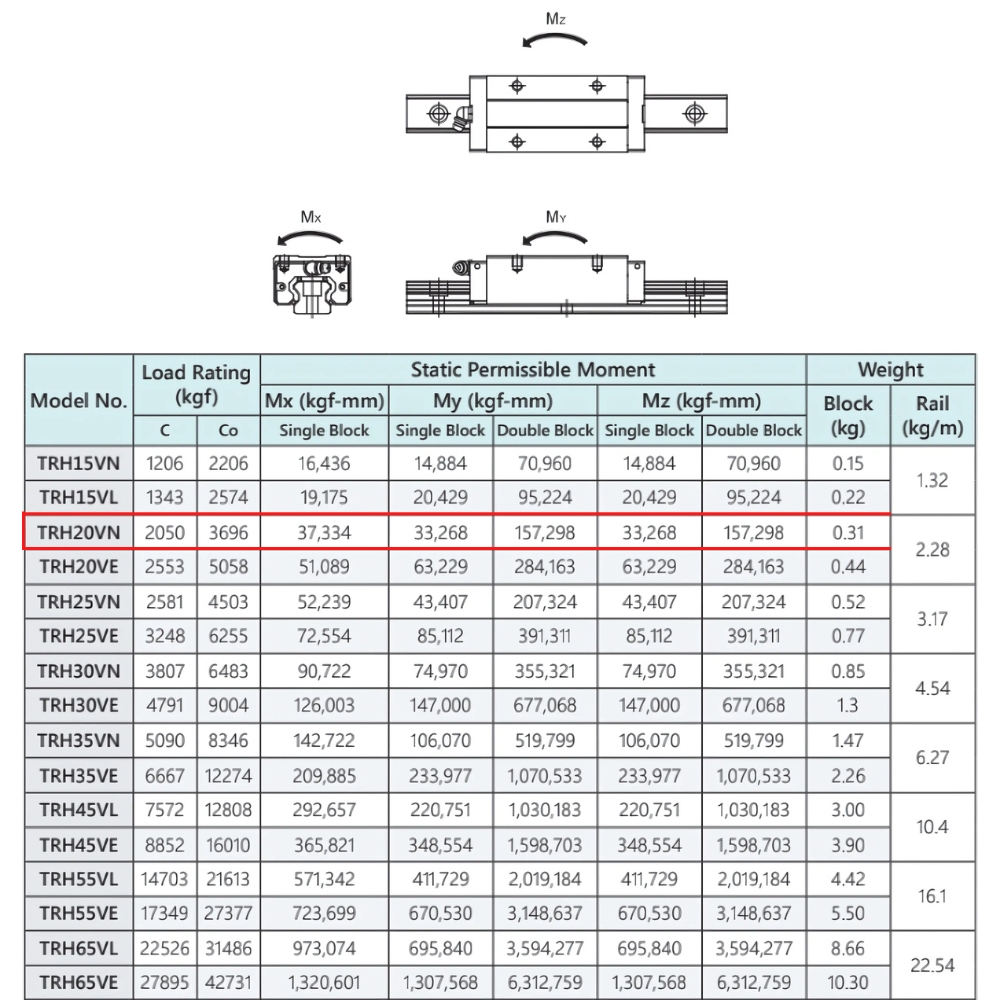 Ảnh thông số kỹ thuật con trượt dẫn hướng TBI TRH20VN
