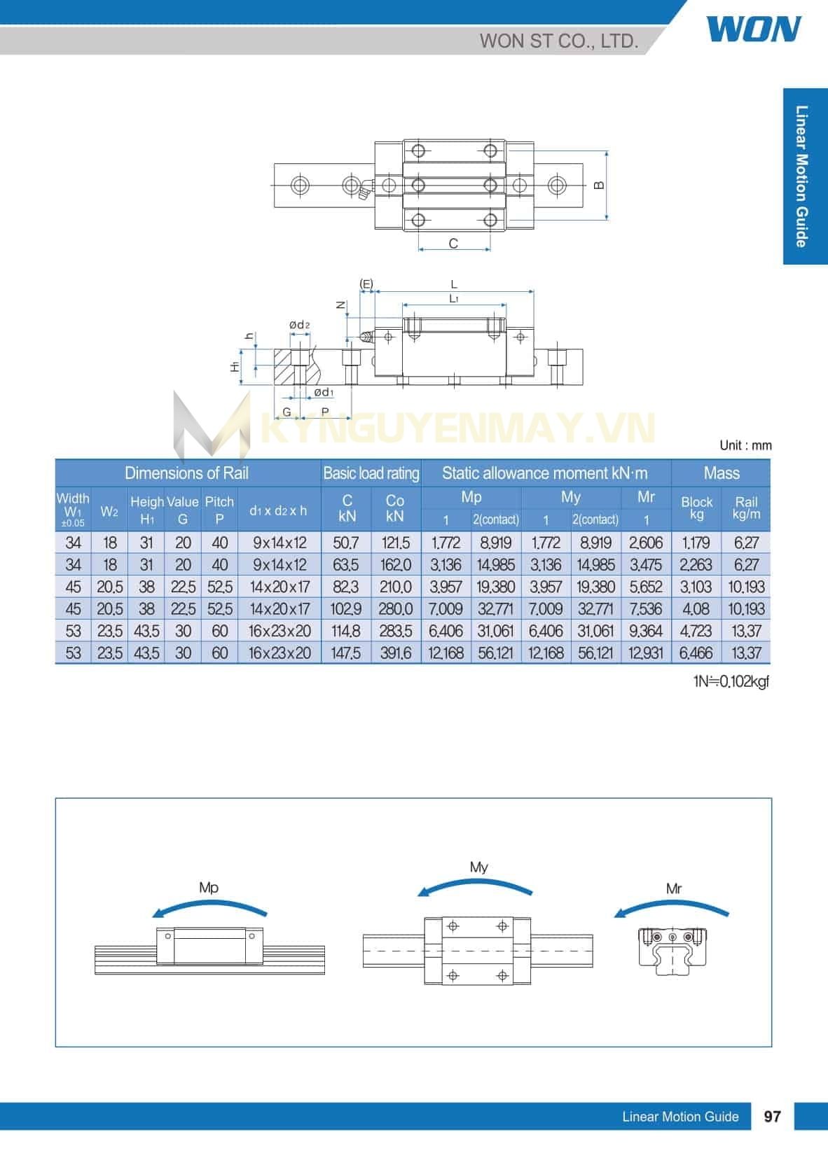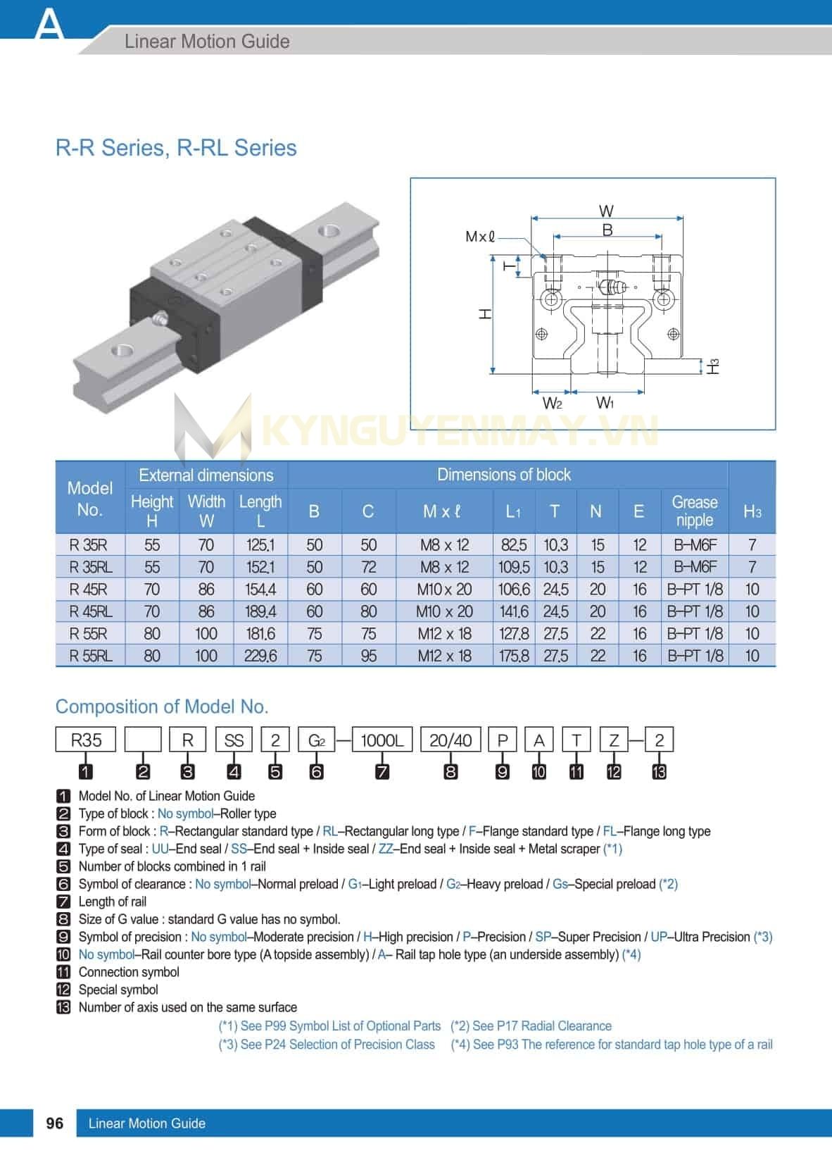 Con trượt WON R-R/RL được chia làm các mã sau dựa: R35R, R35RL, R45R, R45RL, R55R, R55RL