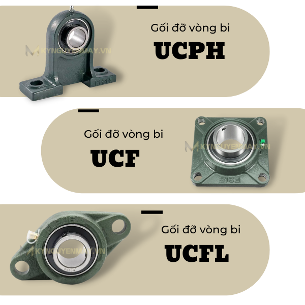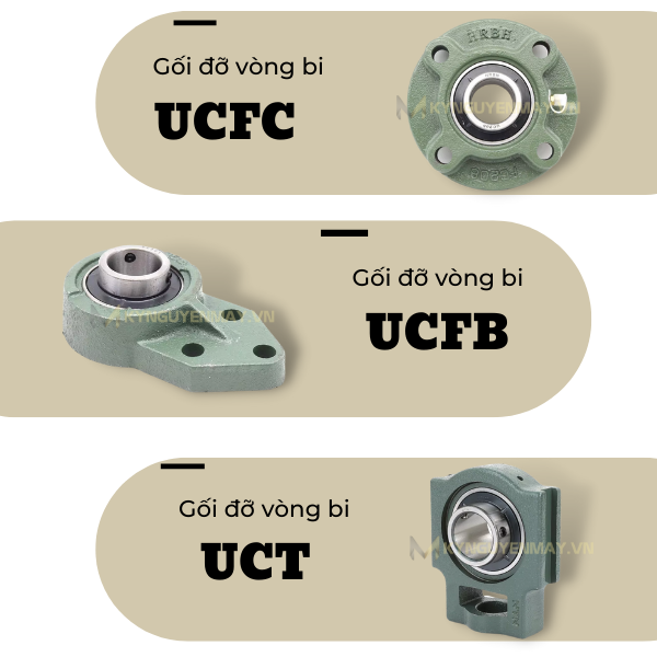 Gối đỡ trục hình trụ, mặt phẳng, mặt cầu, mặt bích, … Trong đó, vỏ gối đỡ thường được làm từ gang hoặc thép, có chức năng bảo vệ vòng bi và kết nối với các bộ phận khác của máy. Vòng bi được lắp bên trong vỏ gối đỡ, có chức năng giảm ma sát và cho phép trục quay trơn tru.