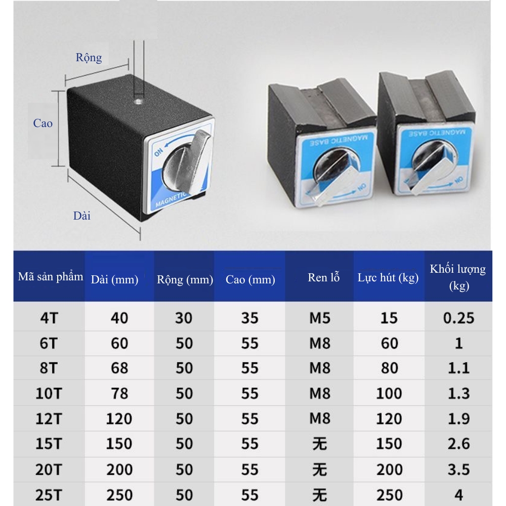 Để đảm bảo khả năng kẹp chặt và cố định phôi tối ưu trong quá trình gia công, việc nắm rõ thông số kỹ thuật đế từ nam châm on/off là rất cần thiết. Các model 15T, 20T, 25T được thiết kế với lực hút mạnh, thao tác bật/tắt linh hoạt và độ ổn định cao. Dưới đây là bảng thông số chi tiết giúp người dùng dễ dàng lựa chọn nam châm phù hợp với nhu cầu sử dụng thực tế.