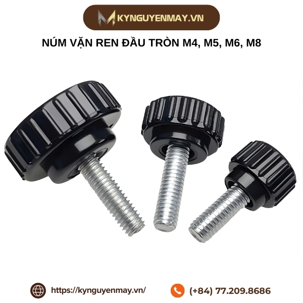 Núm vặn ren đầu tròn M4, M5, M6, M8 là linh kiện có thiết kế dạng trụ tròn, phần đầu bằng nhựa đen bóng, viền ngoài được tạo rãnh dọc đều nhau giúp tăng ma sát khi cầm nắm và dễ thao tác vặn siết. Thân dưới gắn liền với trục ren kim loại mạ sáng, được tiện chuẩn xác, cho khả năng lắp ráp chắc chắn và ổn định. Kéo xuống để tham khảo chi tiết thú vị linh kiện!