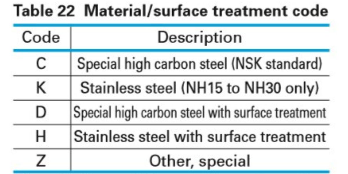 C: Thép cacbon cao đặc biệt (tiêu chuẩn NSK) K: Thép không gỉ (chỉ áp dụng cho NH15 đến NH30) D: Thép cacbon cao đặc biệt có xử lý bề mặt H: Thép không gỉ có xử lý bề mặt Z: Khác, đặc biệt |